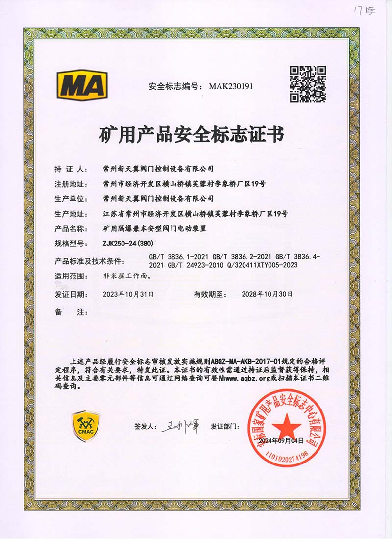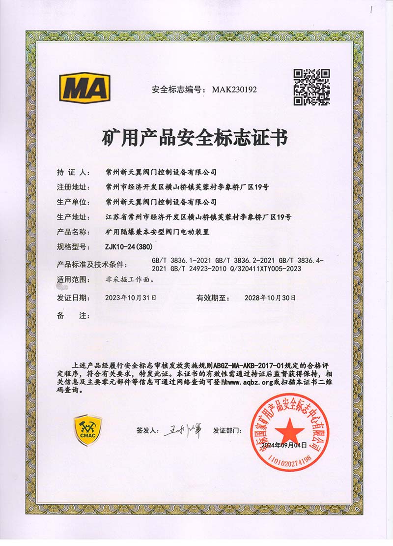 礦用產(chǎn)品安全標(biāo)志證書ZJK180-24(380)