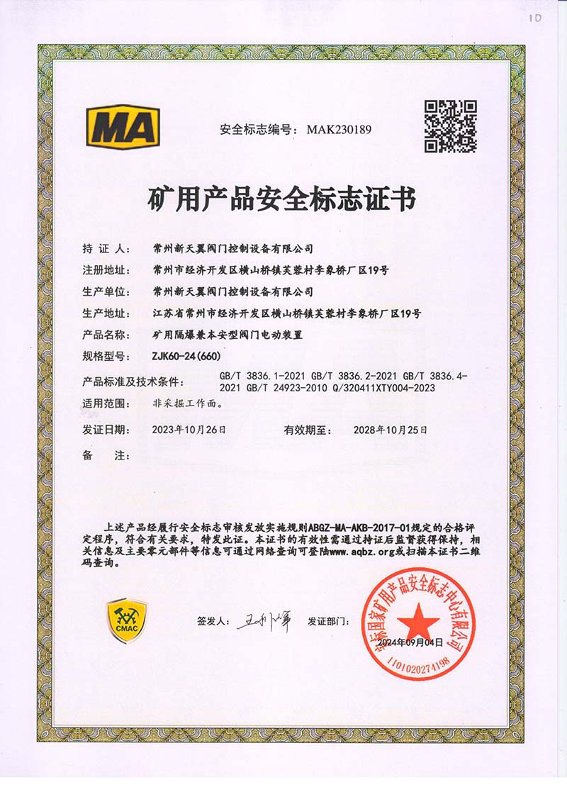 礦用產(chǎn)品安全標(biāo)志證書ZJK60-24(660)