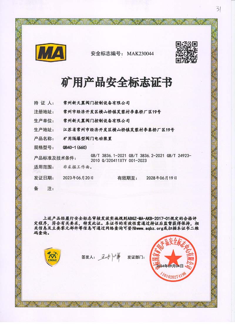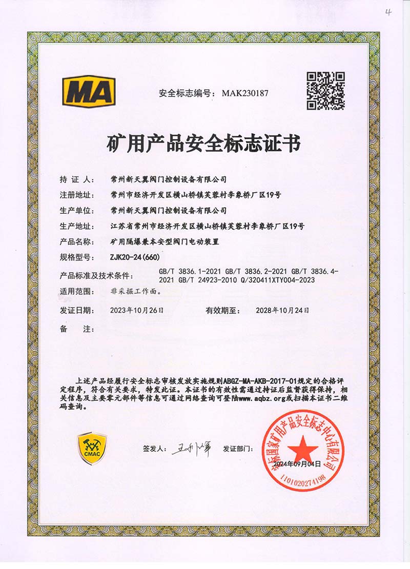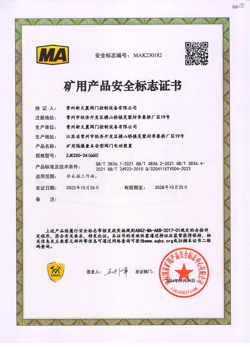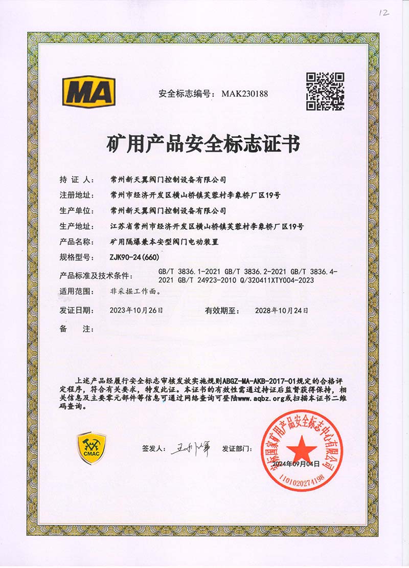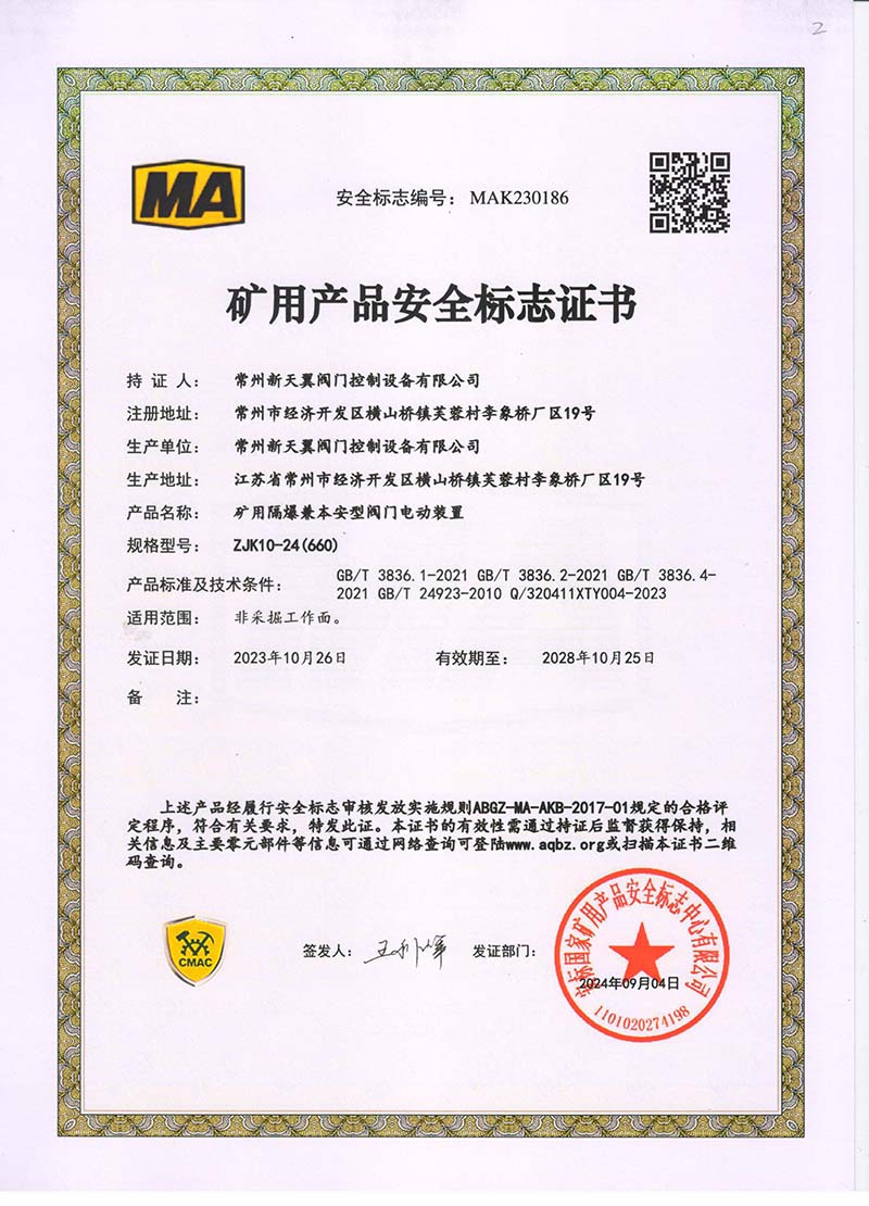 礦用產(chǎn)品安全標(biāo)志證書ZJK180-24(660)