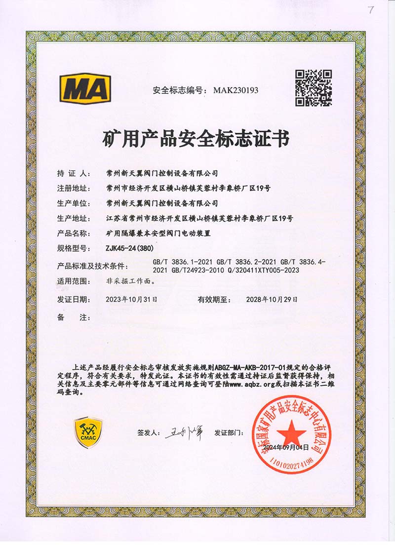 礦用產(chǎn)品安全標(biāo)志證書ZJK45-24(380)