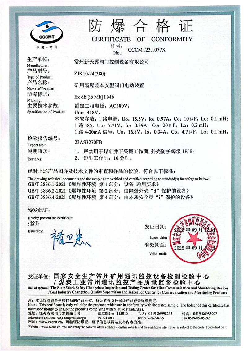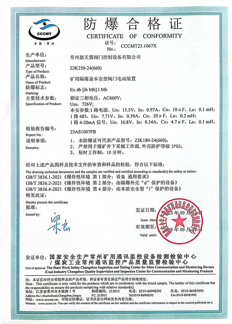 礦用產(chǎn)品安全標(biāo)志證書ZJK20-24(380)