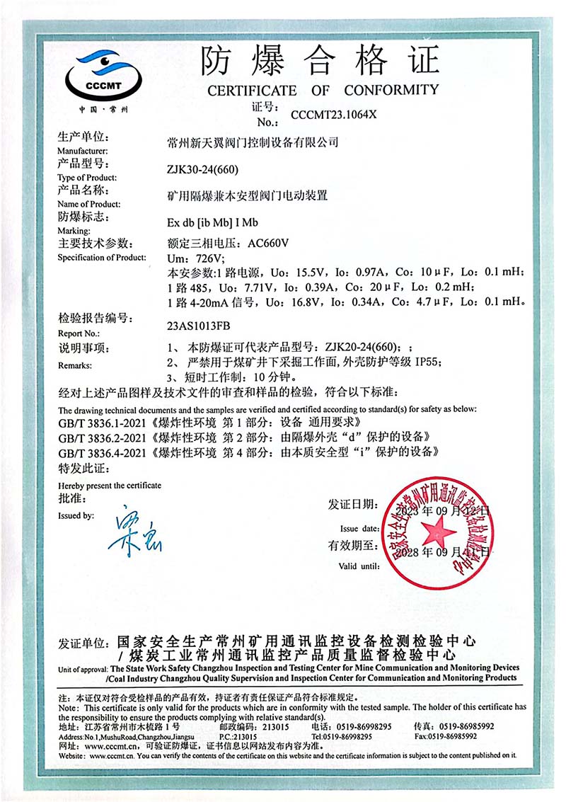礦用產(chǎn)品安全標(biāo)志證書ZJK30-24(660)