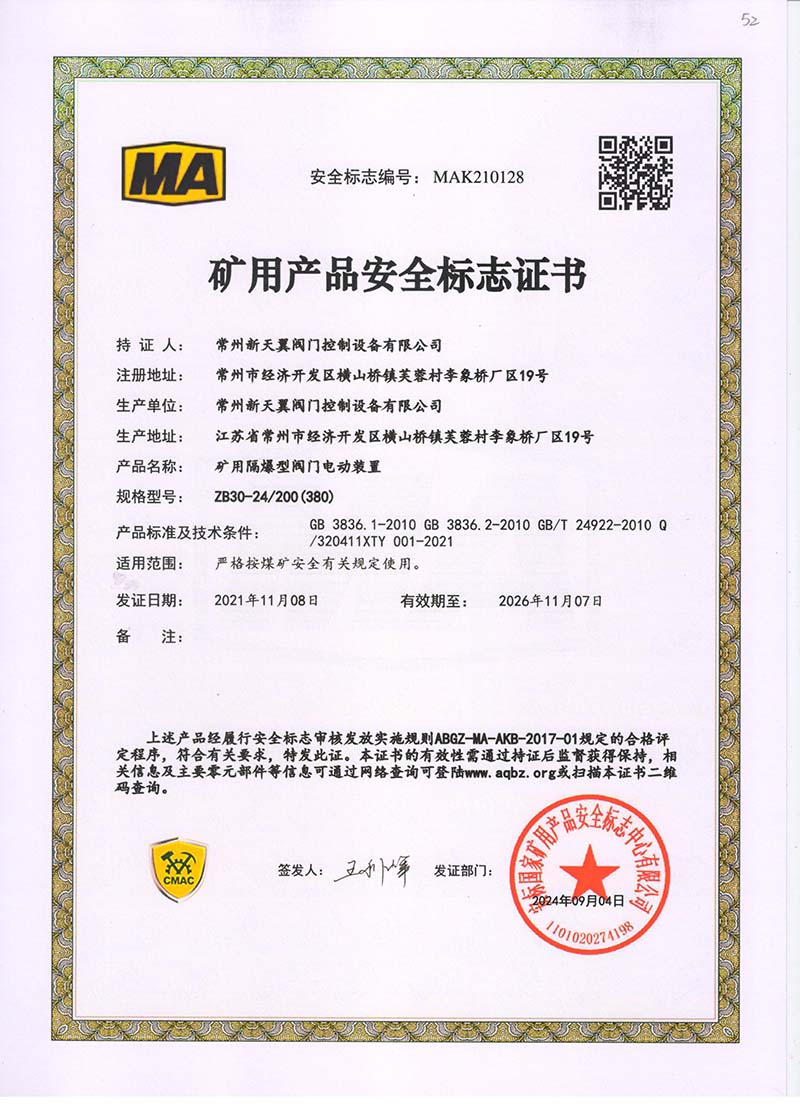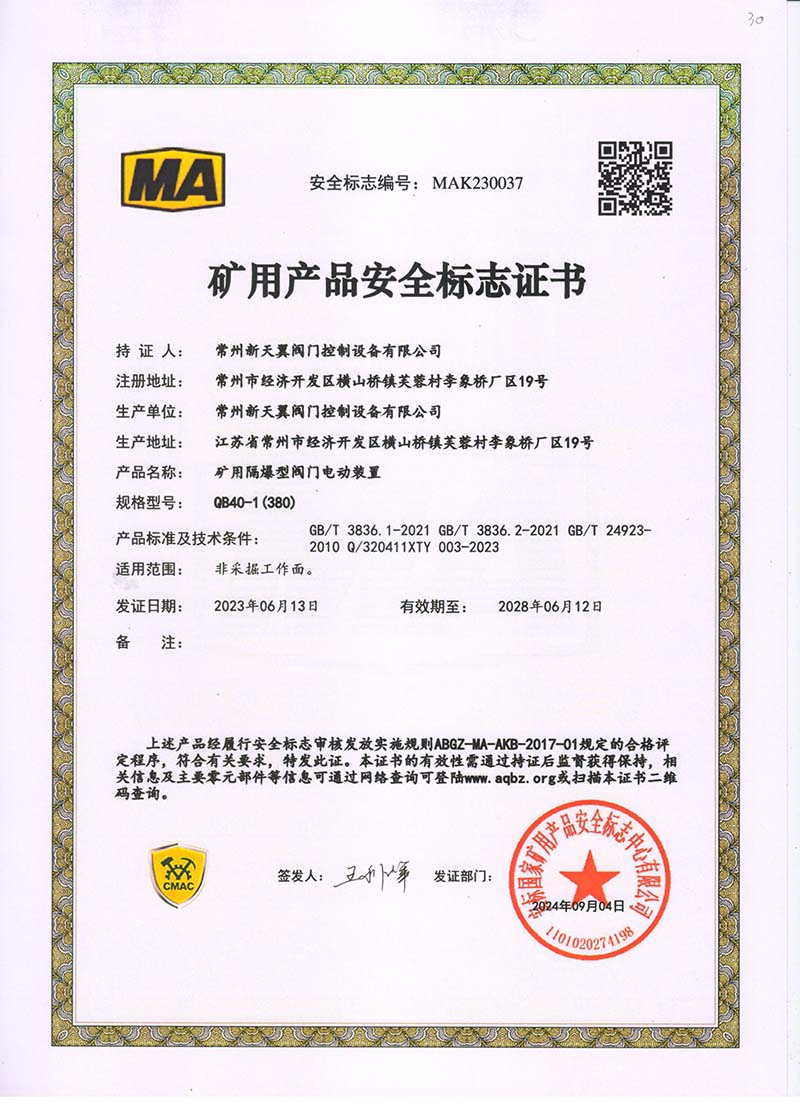 礦用產(chǎn)品安全標(biāo)志證書ZJK30-24(380)