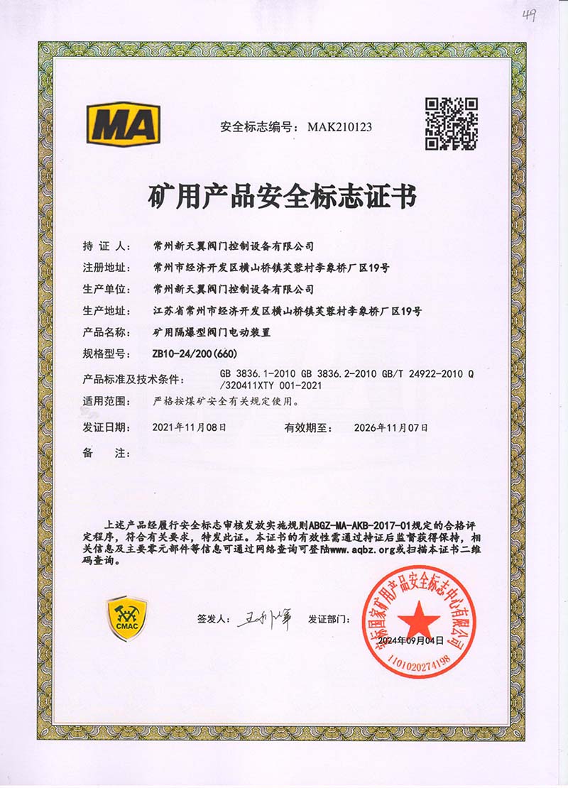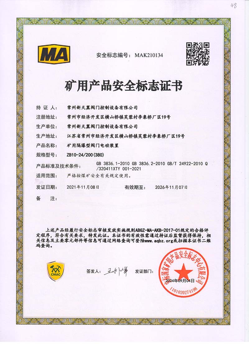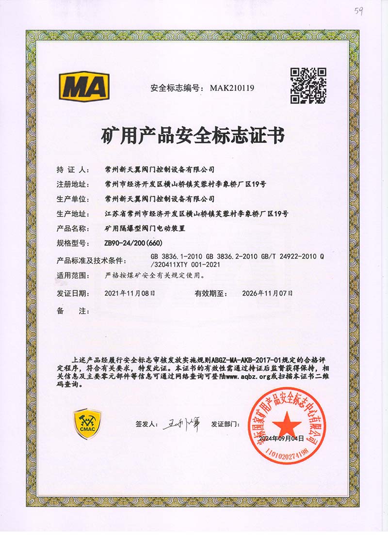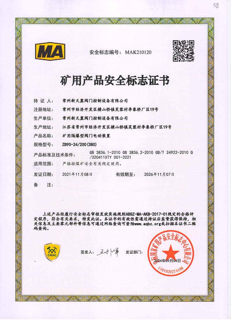 礦用產(chǎn)品安全標(biāo)志證書ZB60-24 200(660)