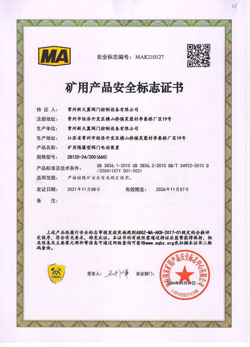 礦用產(chǎn)品安全標(biāo)志證書ZB120-24 200(660)
