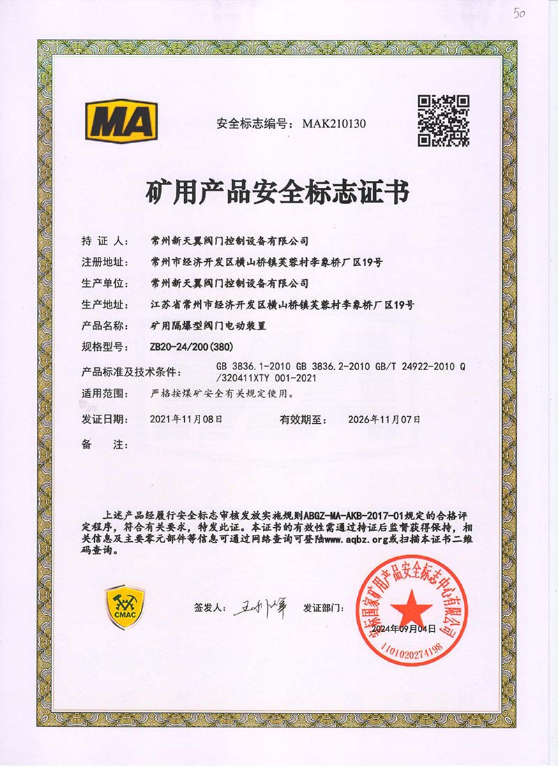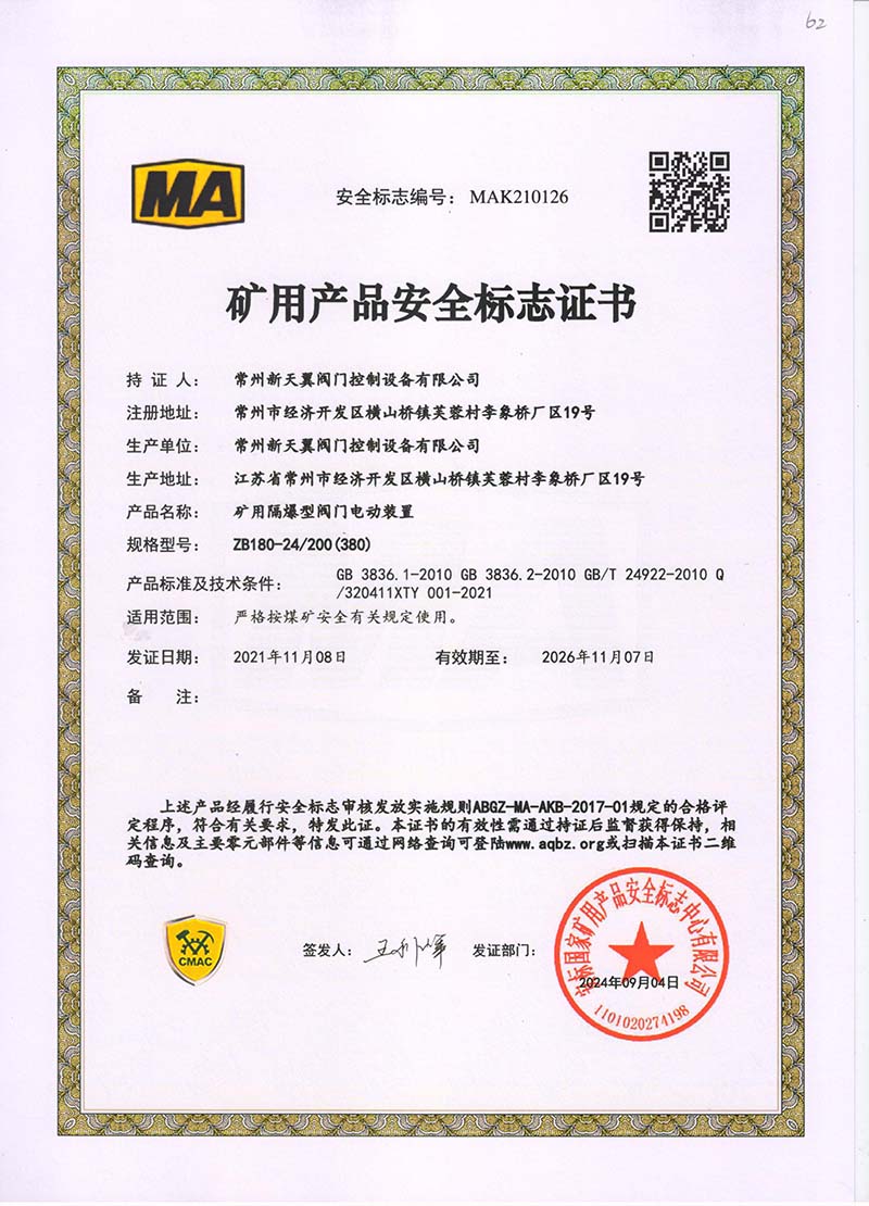 礦用產(chǎn)品安全標(biāo)志證書ZB180-24 200(380)
